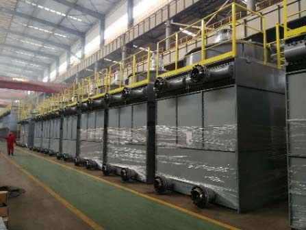 特點(diǎn):傳熱單元為全焊式板束,風(fēng)機(jī)采用垂直安裝的引風(fēng)式風(fēng)機(jī)。整體采用分體式撬裝組合結(jié)構(gòu),運(yùn)輸、檢修方便。采用特殊的板型作為傳熱元件,便于清洗吹灰。傳熱面積均為一次傳熱面積,與翅片管相比其傳熱性能具有長效性。板程流道截面大,特別適合于負(fù)壓操作系統(tǒng)等壓降要求嚴(yán)格的冷凝冷卻場合。